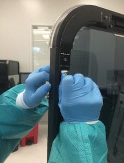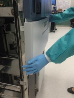 Place the Fusion front panel cover onto the Fusion. Ensure that the cover tabs fit into the grooves on either side of the Fusion chassis and push in to secure the cover flush with the Storage Carousel drawer.