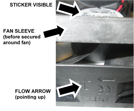 Caution—Verify the sleeve is installed as shown, with the sticker visible on top and the flow arrow pointing up. - Turn the fan over.