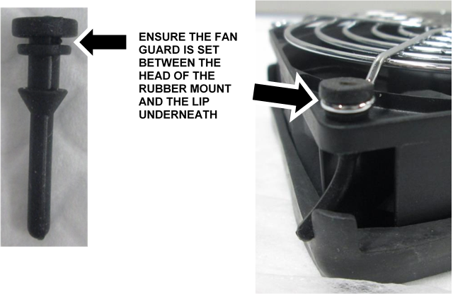 NOTE—Pass the end of the Rubber Mount through the Fan Guard and the hole in the fan, then grab the end from underneath and pull firmly to secure the rubber mount.