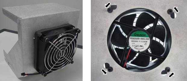 Set the fan onto the front of the fan duct as shown, push the 4 rubber posts through the 4 large holes, then rotate until secure. The power wire can be at the bottom or side or the fan.