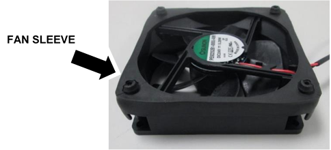Install the black rubber fan sleeve around one of the new fans as shown. (The rubber sleeve is installed on the same side as the sticker.)