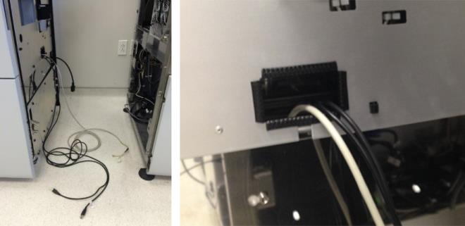 Route the Fusion communications cable up through the rear left of the Panther chassis cable clamps along with the other existing COP cables. This cable should route behind the power cables and behind the cooling line. | Caution—Make sure that the cables are NOT routed through the Panther service drawer frame. Also, the routing of the cable should not interfere with the opening/closing of the service drawer. |
