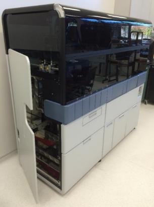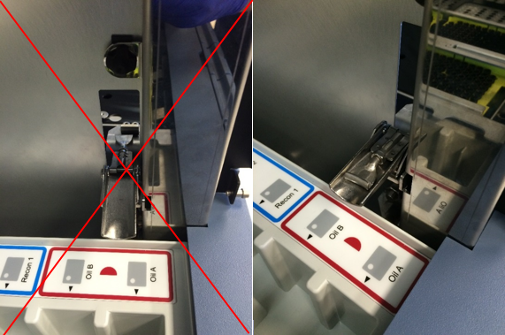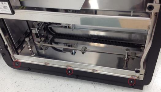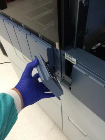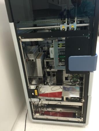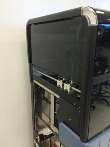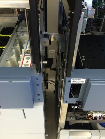 Carefully roll the Fusion into the Panther System. Make sure that the Handoff Station and the Elution Buffer arm do not come into contact with the Panther frame during this movement. Ensure that the Fusion mounting pins insert into the corresponding mounting holes on the Panther System.