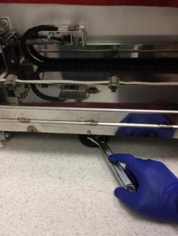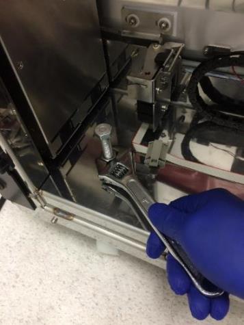 Lower the Fusion leveling foot using an adjustable wrench. The foot should be lowered just enough such that the left side of the system is slightly raised to relieve stress on the Panther frame.