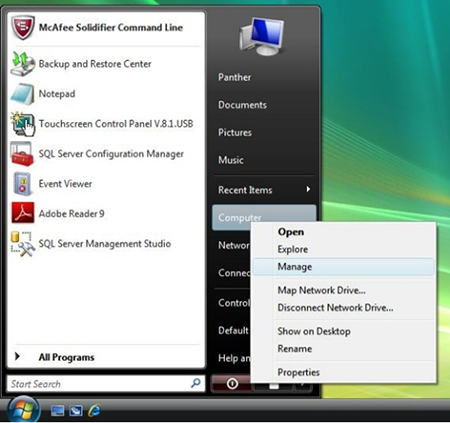click on the Start menu. Right-click on Computer and select Manage.