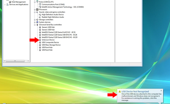 USB Device Not Recognized message displayed on the taskbar.