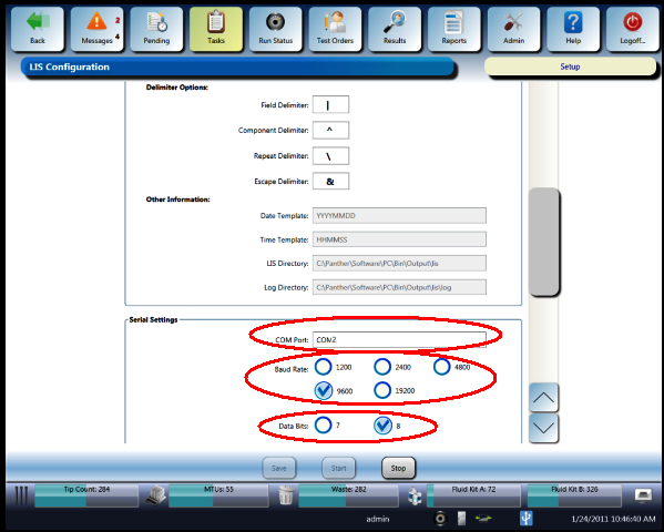- For RS232 Serial connections, determine if the LIS server uses custom or default values for Baud Rate, Data Bits, Stop Bits, and Parity.