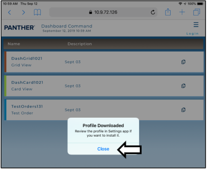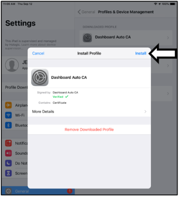 - A Profile Downloaded window opens and instructs the user to continue setup in Settings.
