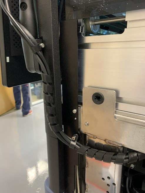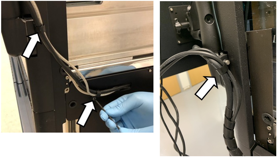 Reroute the monitor cables, loosely install the lower and upper cable clamps, and connect to the monitor.