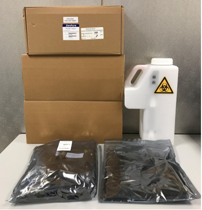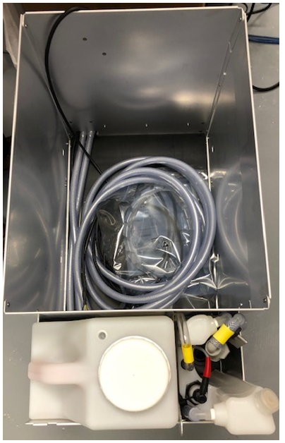 Locate the box containing the waste bottle and tubing.
