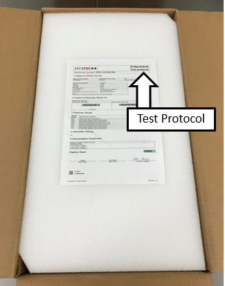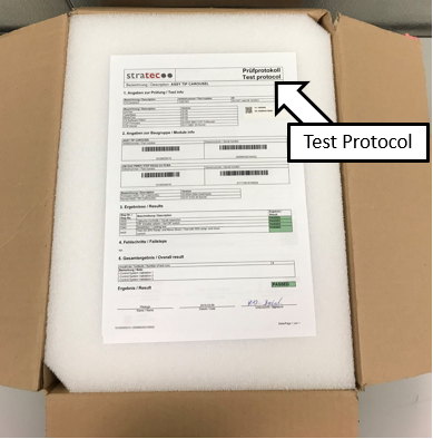 Open the box and set the Stratec Test Protocol sheet aside for the Service Records.