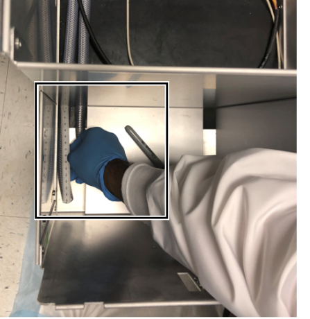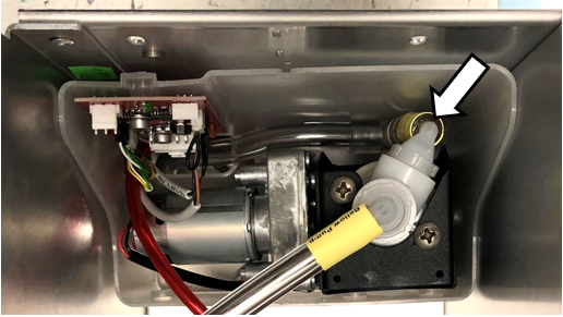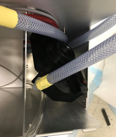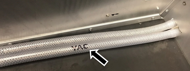 - Remove the nuts securing the tubing clamps that hold the vacuum line to the filter area in the front of the waste drawer.