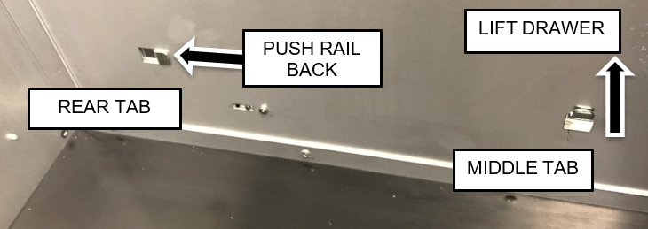 Pull the drawer up to free it from the forward two tabs and slide the drawer rail back to free if from the rear tab.