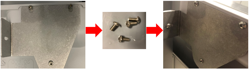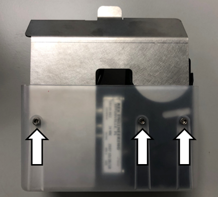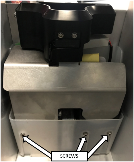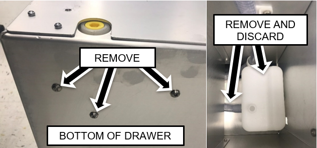 Use a Phillips screwdriver to remove the three screws securing the coalescing trap to the bottom of the drawer. - Remove and discard the coalescing trap along with the connected tubing.