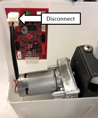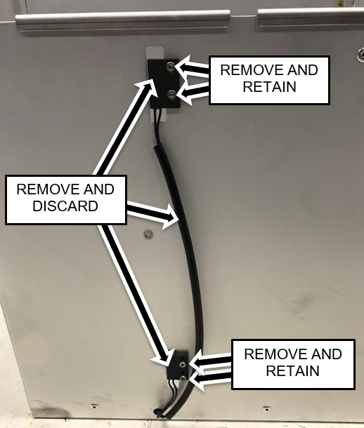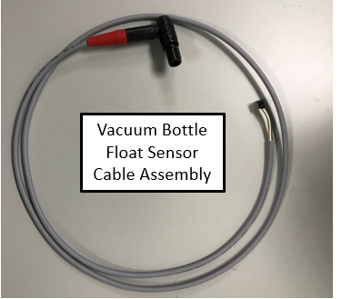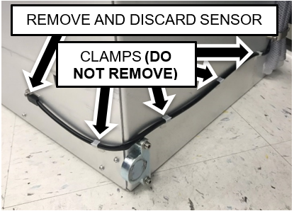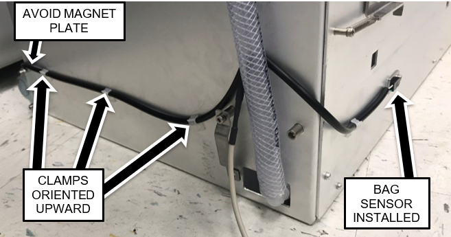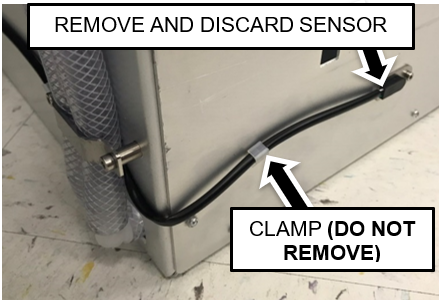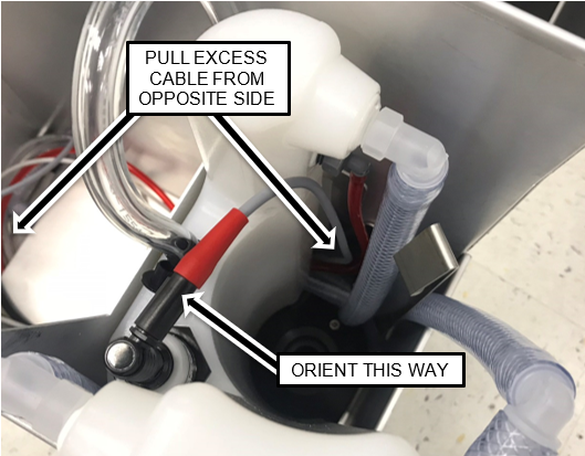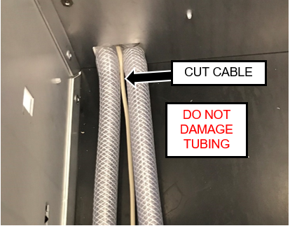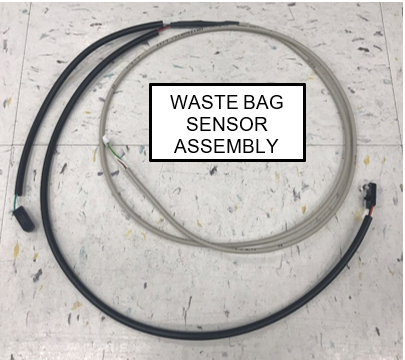 Cut the two sensor cables (Waste Bag Presence and Waste Bottle Full/Empty) near their cable clamp as shown below. The sensor cables are located behind the vacuum housing in the rear of the lower chassis.