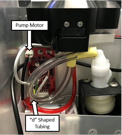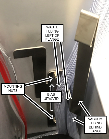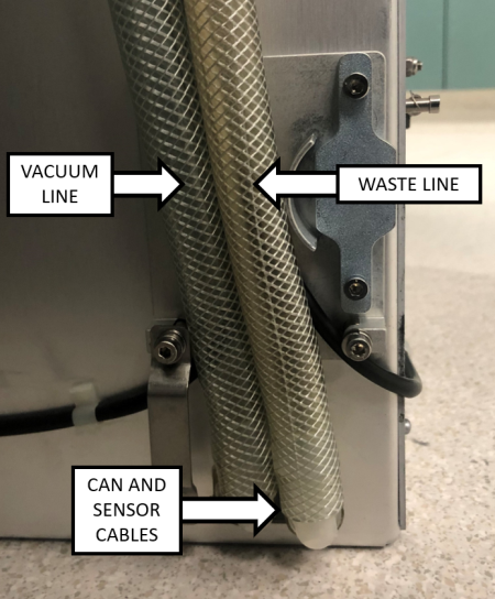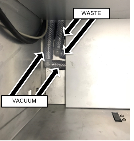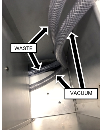 The Vacuum line should be on the left and Waste line on the right (when viewed from the rear).- Re-attach the metal tubing clamp.
