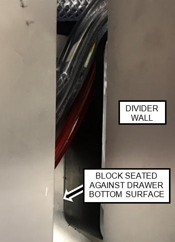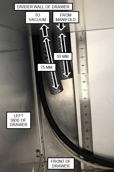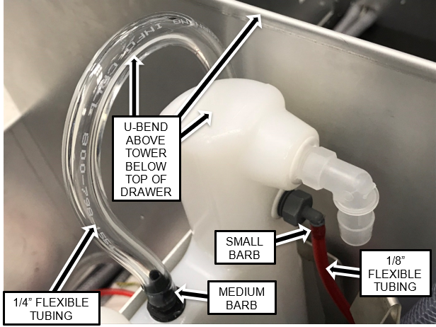 Note—The 1/4" flexible tubing should form a u-bend above the "tower" of the vacuum bottle as shown but not above the top of the drawer. The tubing lengths can be adjusted by pulling the tubing from left side of the drawer or vice versa.