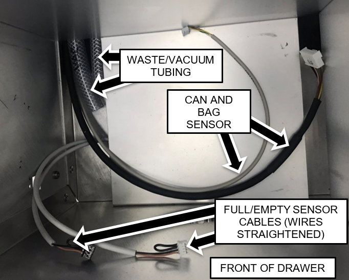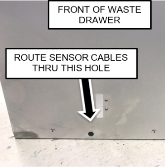 Route the Full/Empty Sensors to the front left corner of the Waste Drawer as shown.