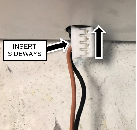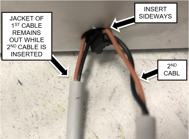 Note—The connectors must be oriented sideways to insert them into the hole. Do NOT insert the cable fully until the second connector is inserted.