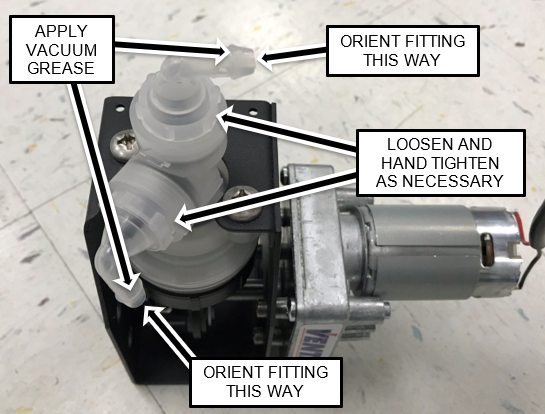 Apply vacuum grease to the outside surface of the one small and one medium sized barbed fittings on the Vacuum Bottle.