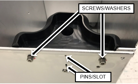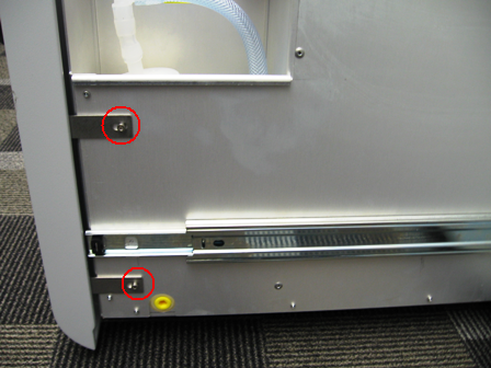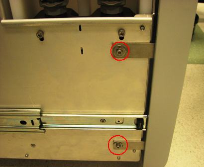 Remove and retain one of the screws securing the lower tubing clamp to the standoffs on the back of the drawer. Loosen the other screw and move the clamp aside.