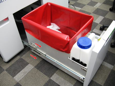 - Place enough blue pads to cover the floor below the Waste Drawer.