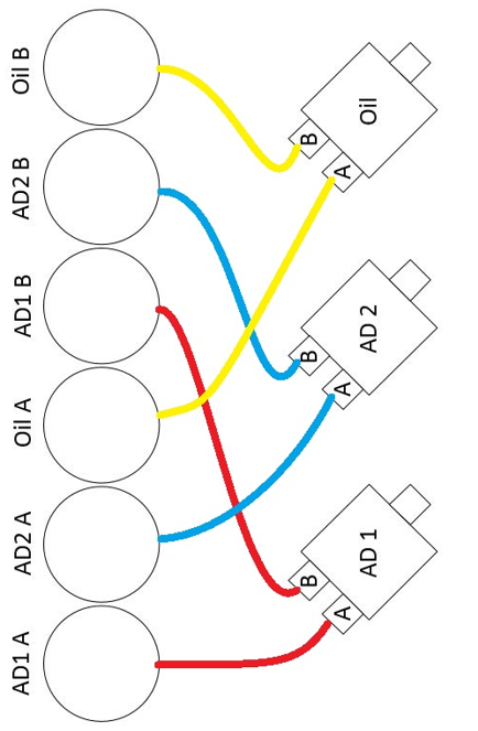 One at a time remove the AD1B, AD2A & B, and Oil A lines and reroute per the picture below.