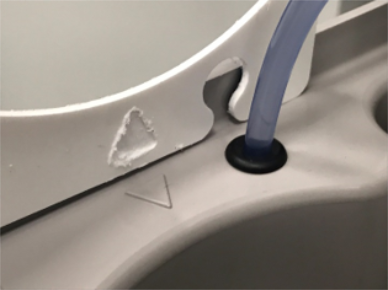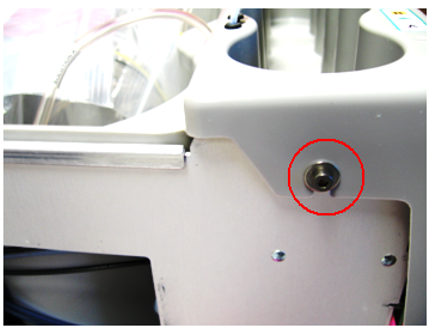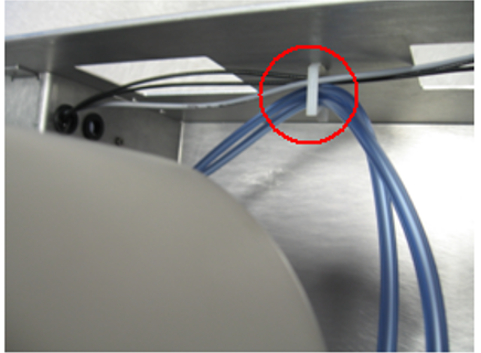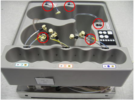 - Remove the large O-ring (between the two smaller O-rings) in the top panel of the tub between fluid lines for AD1, AD2, and Oil.