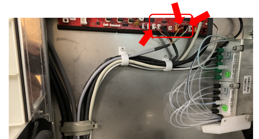 Insert the Pump Signal Cable and Pump to Waste Drawer Tubing through the grommet in the back plate as shown.
