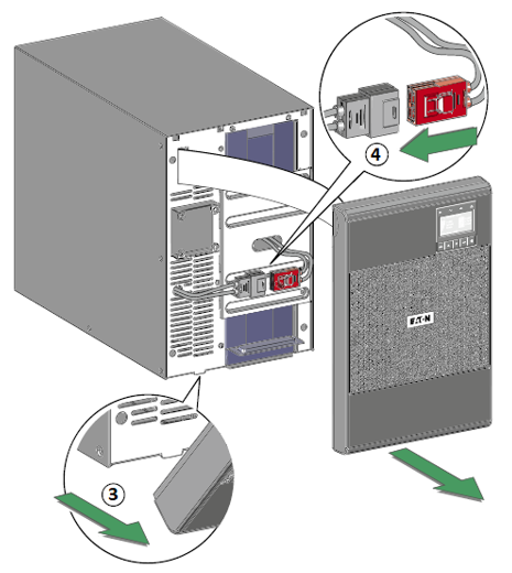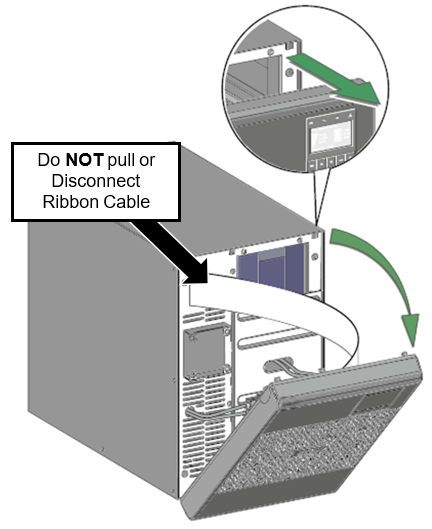 NOTE—A ribbon cable connects the LCD control panel to the UPS. DO NOT PULL OR DISCONNECT THE RIBBON CABLE. - Remove the lower part of the front panel.