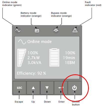 - Check the UPS front panel display for active alarms or notices. Resolve any active alarms before continuing. If the Fault indicator is on, do not proceed until all alarms are clear. Correct the alarms and restart if necessary.