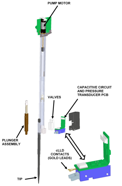 - As the pipettor moves down in the Z-direction, the cLLD contacts measure an electrical signal.