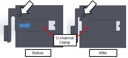 Loosen the thumbscrew (white arrow below) and pull the U-channel clamp back. Then, retighten the thumbscrew to hold it in position.