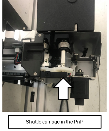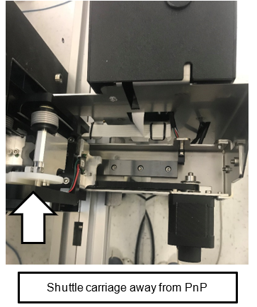 Manually move the Shuttle carriage towards the Sample Bay and away from the Pick-and-Place (PnP) location until the alignment plate drops into the Shuttle.