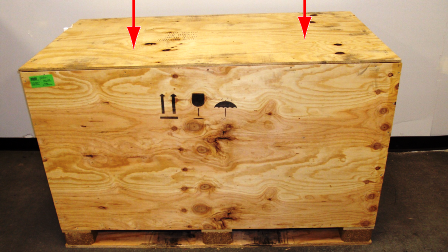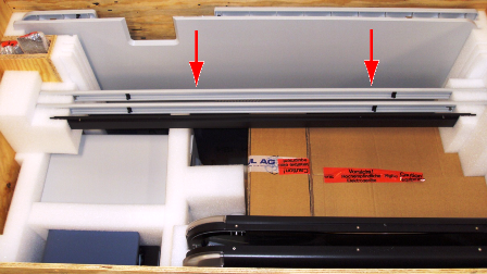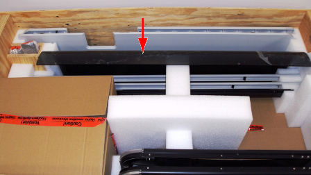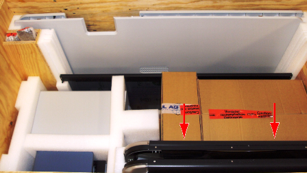 Place the left and right Canopy panels to the front of the crate as shown in the following photo. The left Canopy panel goes in the inner-most groove and the right Canopy panel goes in the front-most groove.