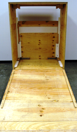 Prepare the empty crate for shipping. On the front side of the crate, remove the 2 screws that secure the ramp board.