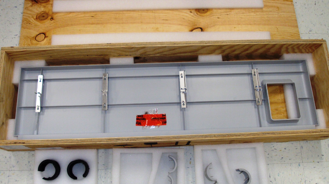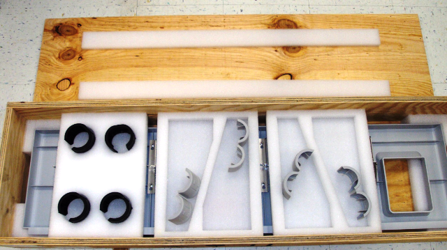 Place the Mid Bay cover face up in the crate. Place the cover securely between the side foam blocks and the corner foam blocks.- Insert the TCR