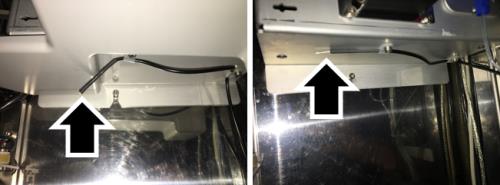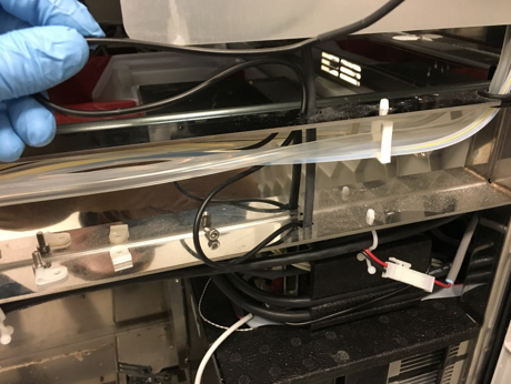 Locate the Ambient Temperature Sensor underneath the Pump Module. The sensor is held in place with two cable harnesses attached to the bottom of the LCMP housing. Some systens have a drip shield that is also held in place with these screws.