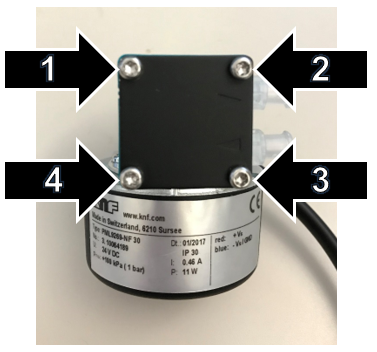 Reassemble the 3 layers of the pump head and reattach it to the pump housing with the 4 screws (and washers, if used) from Step 6.