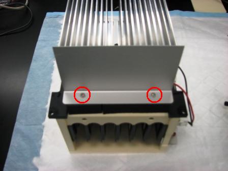 Using a 2.5 mm Allen wrench, remove the two screws that secure the Peltier shroud and remove the shroud.