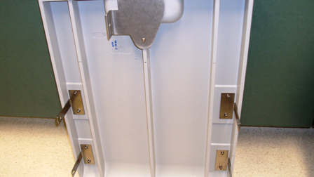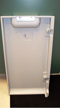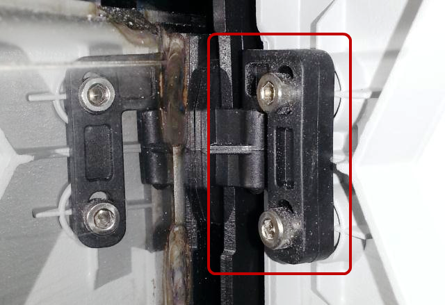 - Using the four provided 2.5 mm screws, and a 2.5 mm hex key, tighten the two screws to the bottom door hinge, and two screws to the top door hinge.