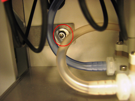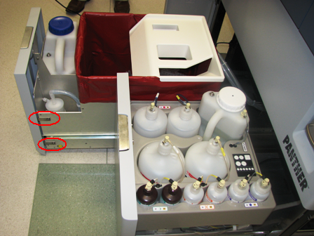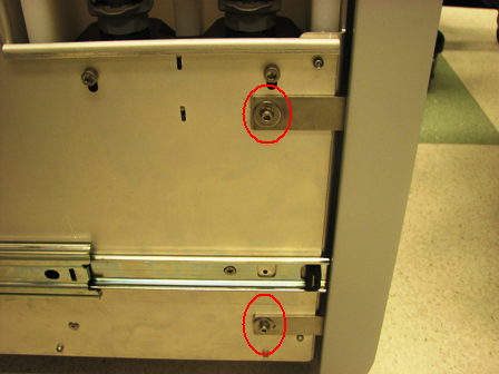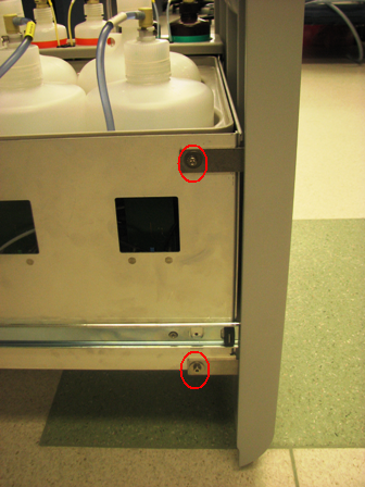 Using two 3 mm screws, a washer, lock washer, and a 3 mm hex key, tighten the two screws on the left side of the Universal Fluid Drawer.