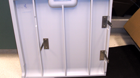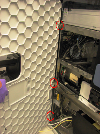 Place the left door panel on the three hinges located on the back left side of the Panther system. Slide the pin of the door hinge onto the door bracket for all three brackets.