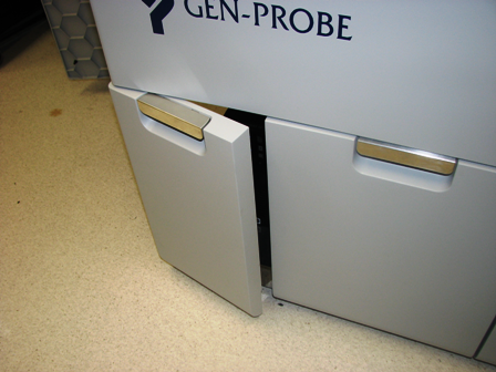 In the same manner as the Waste Drawer, align the front panel to the two screws on the left side of the drawer, and the one screw on the right side of the drawer.