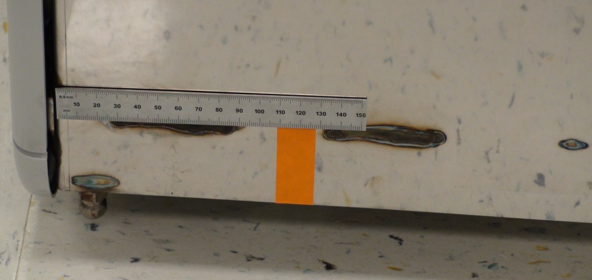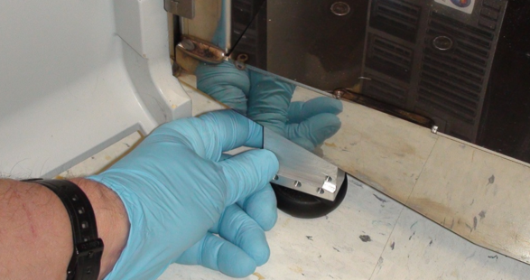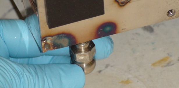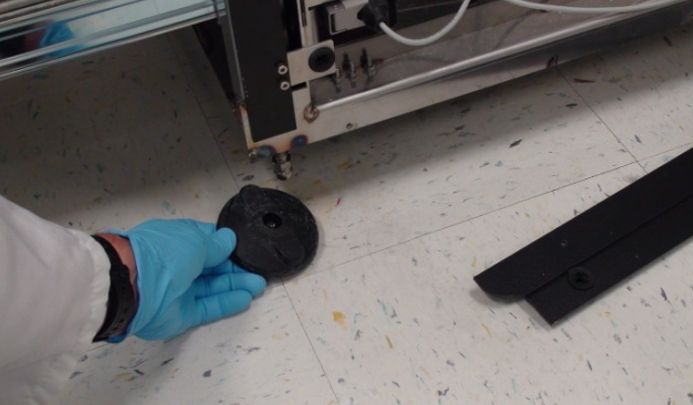 When installing in the rear, the replacement foot should be installed close to the original foot location. Note that the exhaust muffler is ported through the bottom of the Panther near the right rear corner and should not be obstructed. The vacuum exhaust is ported out the bottom of the Panther around 120mm from the edge of the system behind the Liquid Cooling Module. The replacement foot should be placed such that it doesn't interfere with the exhaust.