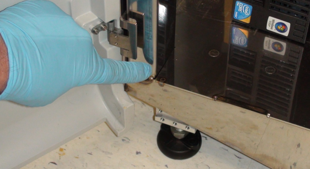 - Open the Universal Fluids Drawer or computer access door as required to access the existing front feet.