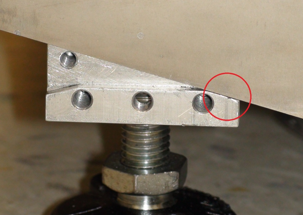 The top of the block should be in contact with the underside of the Panther. The front of the block should be in contact with the frame skirting and for feet being installed on the front of the Panther, the small ledge should be in contact with the bottom of the Panther skirting. When a foot is being installed in the rear of the Panther, the foot should be placed as close to the original foot position as practical.  | Note—When mounting in the rear of the system the skirting will not be touching the ledge formed in the replacement foot but should be about 2mm above the ledge. |