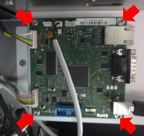 Disconnect all the cables from the COP. Label the cables or take a picture to ensure proper connections after replacement. Then remove and save the 4 hex screws shown (2.5mm) and remove the COP.