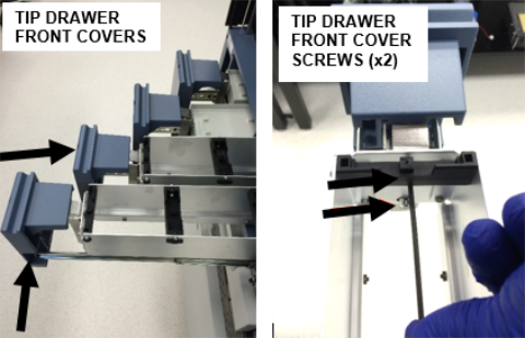 remove the two Tip Drawer front covers. - Using a 3mm hex driver,