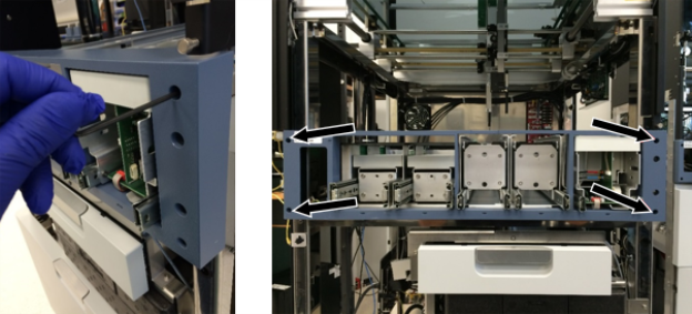 remove the two Reaction Tube Tray front covers. - Using a 3mm hex driver,